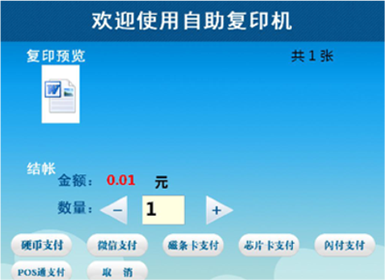 通過文件掃描、上傳云端等技術(shù)實(shí)現(xiàn)身份證復(fù)印、文件復(fù)印、手機(jī)文件打印、U盤文件打印等功能,支持投幣、微信、支付寶、云閃付等多種支付方式,可靈活的部署在商場(chǎng)、社區(qū)、工業(yè)園、辦事大廳等有復(fù)印打印需求的場(chǎng)合。便民復(fù)印機(jī)操作簡(jiǎn)單,可以無人值守,24小時(shí)提供服務(wù)。